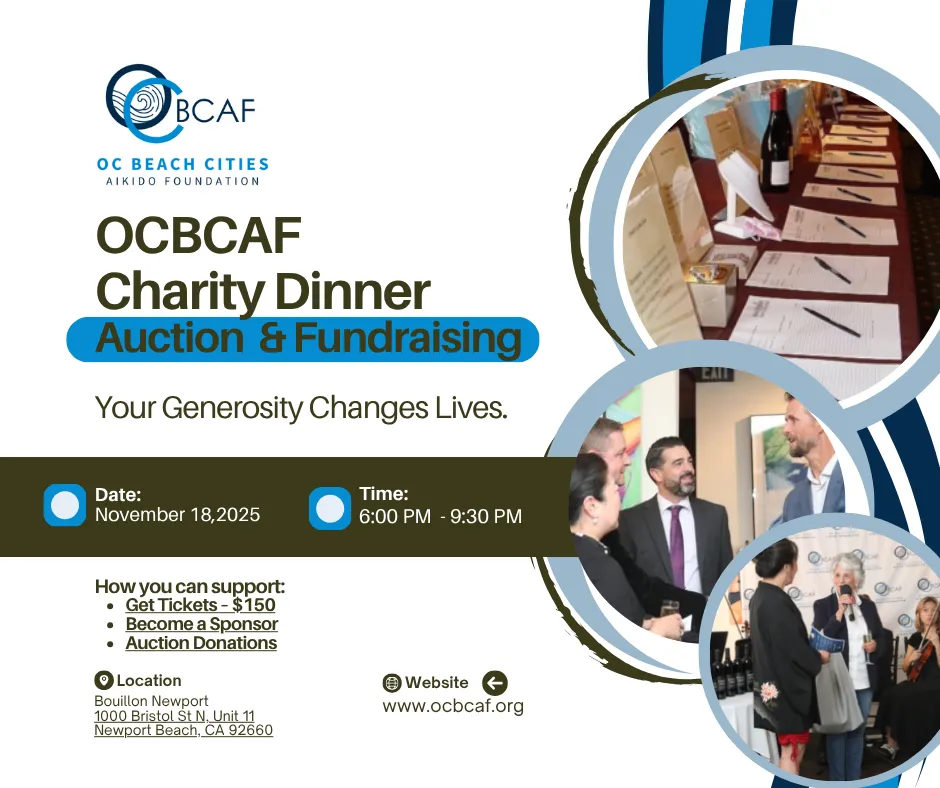 Join us for the OCBCAF Charity Dinner & Auction 2025, a night of celebration, connection, and giving that supports local programs teaching safety, character, and compassion, inspired by the art of Aikido.
